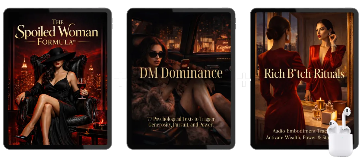 The Seduction Bundle is your invitation into the deeper levels of forbidden feminine power. Alongside The Spoiled Woman Formula™, you’ll unlock the audios, scripts, and rituals that transform you into the kind of woman rich men sense before they even see you.
